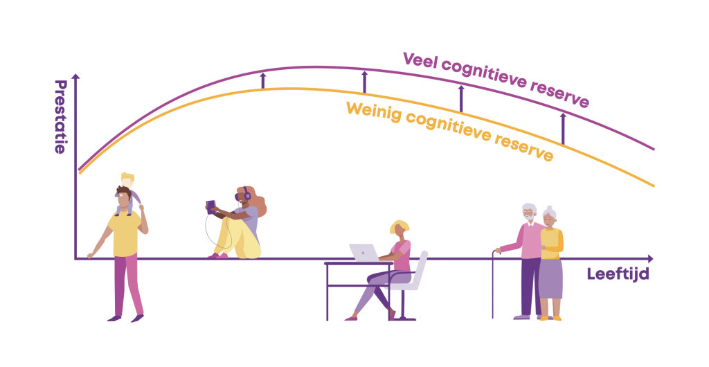 Op het moment dat je hersenen zich inspannen, bouwen ze cognitieve reserve op. Door de opbouw van cognitieve reserve, kunnen je hersenen compenseren voor schade. Op deze manier kun je langer op hetzelfde niveau presteren. Het kan niet voorkómen dat je hersenen verouderen. Maar het kan wel de klachten die bij veroudering horen, zoals problemen met onthouden of trager denken, uitstellen. En als je bijvoorbeeld dementie krijgt, dan is de ziekte er wel, maar wordt deze pas later zichtbaar dan bij iemand met een minder grote cognitieve reserve. Die reserve beschermt onze hersenen als het ware tegen ouderdomsziekten.