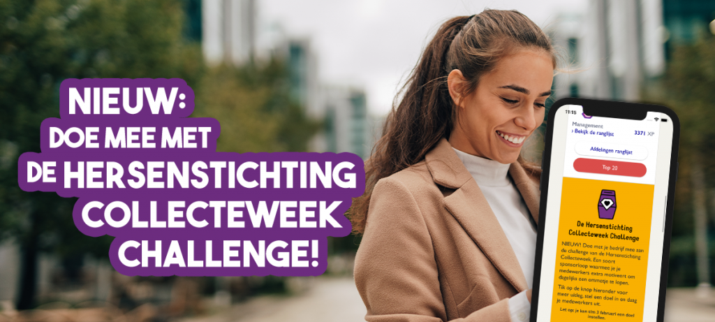 De Collecteweek Challenge is een soort sponsorloop. De bedrijfsleider daagt de deelnemers uit om een totaal aantal kilometers aan ommetjes te lopen voor een bedrag naar keuze. Behaalt jouw team dit doel, dan ontvangt iedereen een unieke badge én dan doet je bedrijf als tegenprestatie een donatie aan de Hersenstichting.